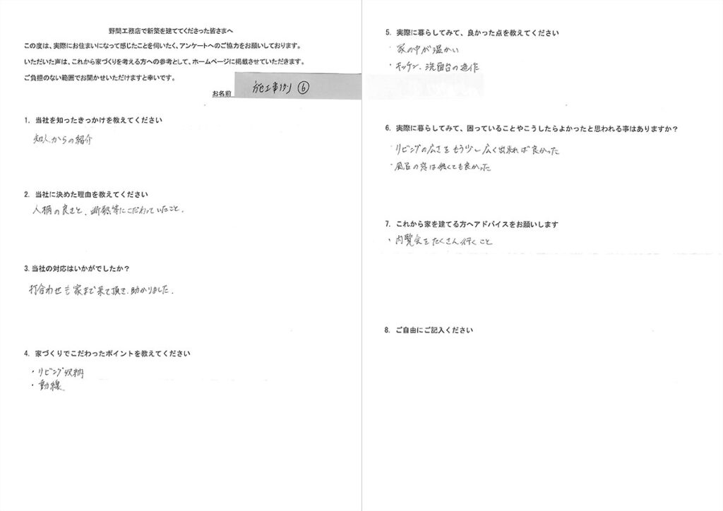 「知人の家を見学し、丁寧な施工と対応を拝見して野間工務店に決めました」